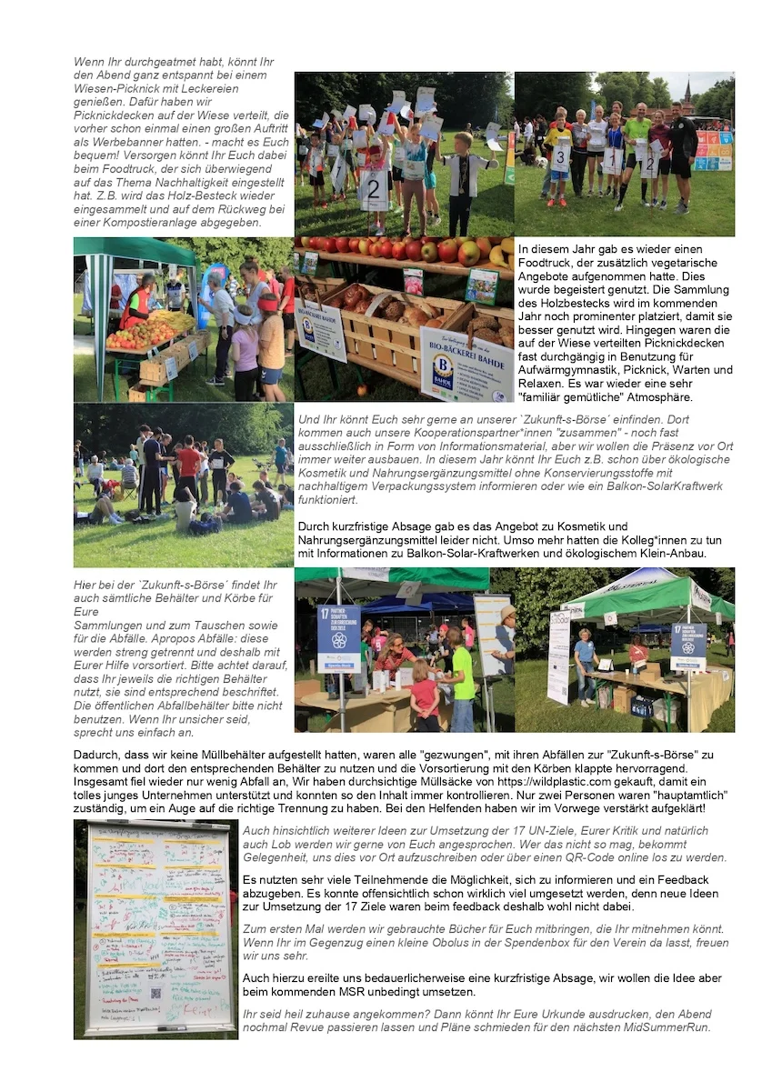 Bei allerbestem Laufwetter konnten sich die Läufer*innen auf der Wiese rund um das Torhaus Wellingsbüttel am Zelt der "Zukunft-s-Börse" über die Kooperationspartner*innen mit ihrem nachhaltigen Tun und über die Funktionsweise von Stecker-Solargeräten ("Balkonkraftwerke") informieren sowie ihr feedback zum Lauf-Event abgeben. Zusammen mit Familie und Freunden haben sie die Wiese für ein gemeinsames Picknick genutzt und den Freitag-Abend nach dem Lauf gemütlich ausklingen lassen.