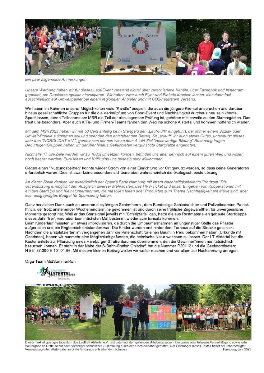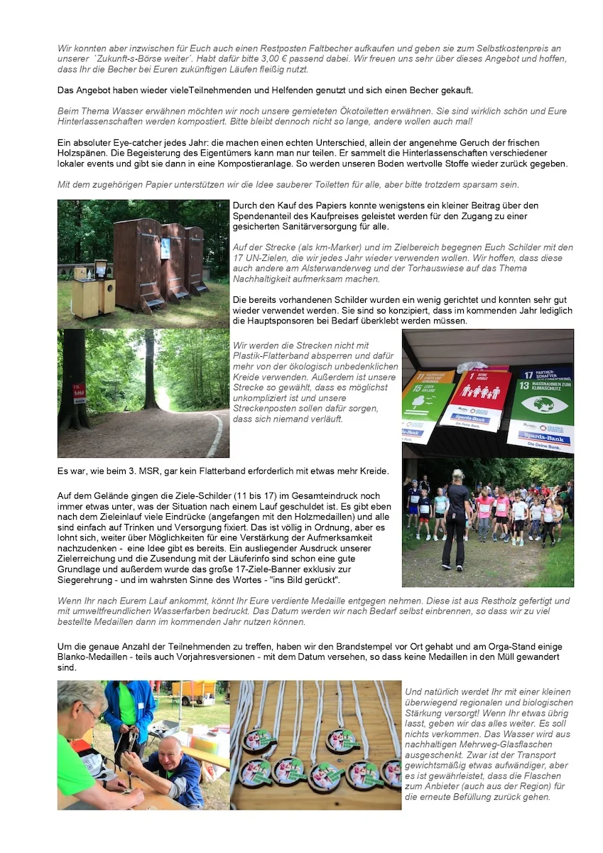 Nach dem tollen Erfolg der Vorjahre organisierte der Lauftreff Alstertal e.V. das Lauf-Event wieder rein ehrenamtlich nach Maßgabe der 17 UN-Ziele für eine nachhaltige Entwicklung. Bei großem gemeinsamem Spaß konnte gezeigt werden, dass Nachhaltigkeit, Ressourcen- und Umweltschonung bei Laufveranstaltungen erreichbar sind: Holzmedaillen, regionale und biologische Versorgung, Öko-Komposttoiletten, strikte Abfalltrennung oder reine unbeschichtete Papierbecher sind nur einige Stichworte zur Umsetzung von refuse, reduce, reuse, recycle (auf Deutsch „ablehnen, reduzieren, wiederverwenden, wiederverwerten“).